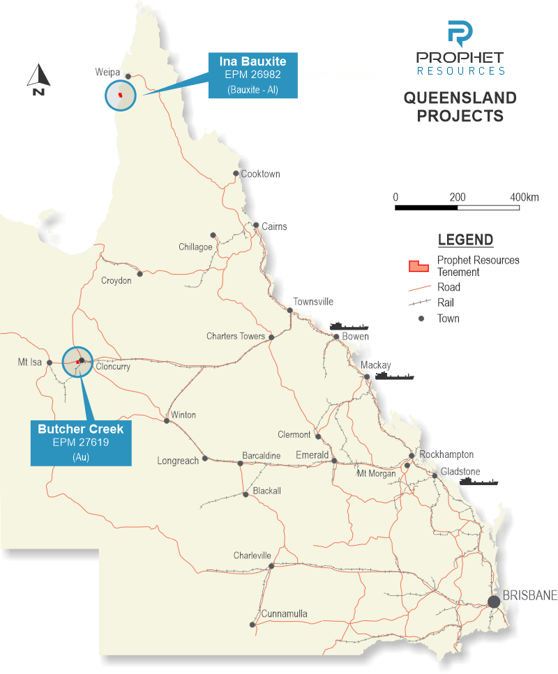 Prophets two directors (both geologists) have project generated and acquired the companies’ past and present mineral properties. The Company currently has the Butcher Creek gold and gold-copper projects near Cloncurry, Queensland and one bauxite project near Weipa. See Figure below for Project Locations.